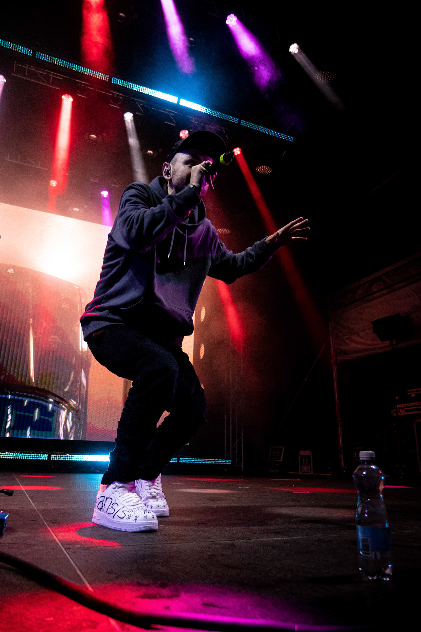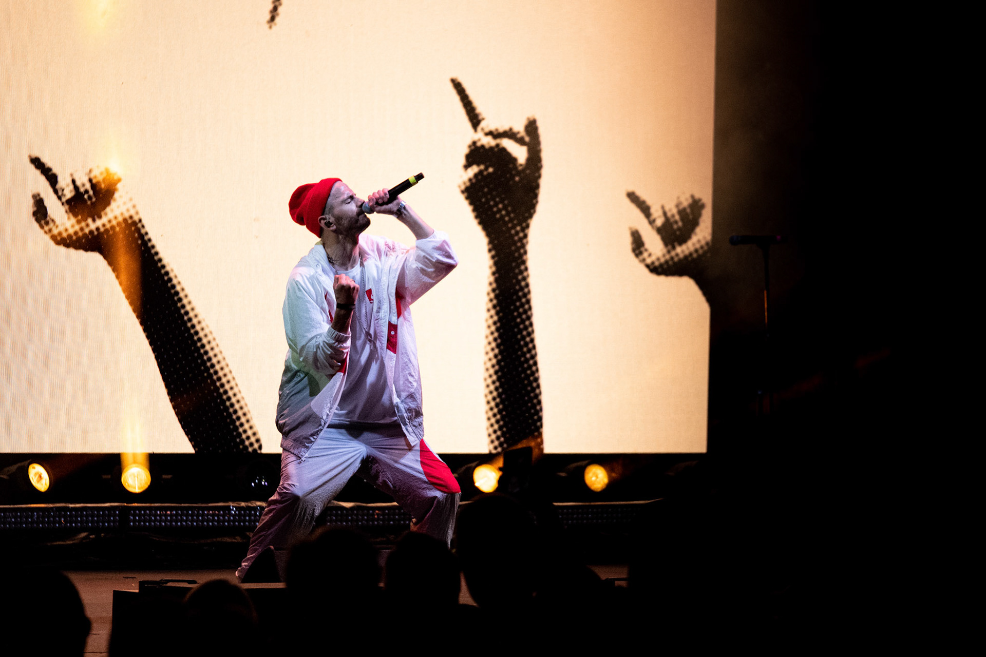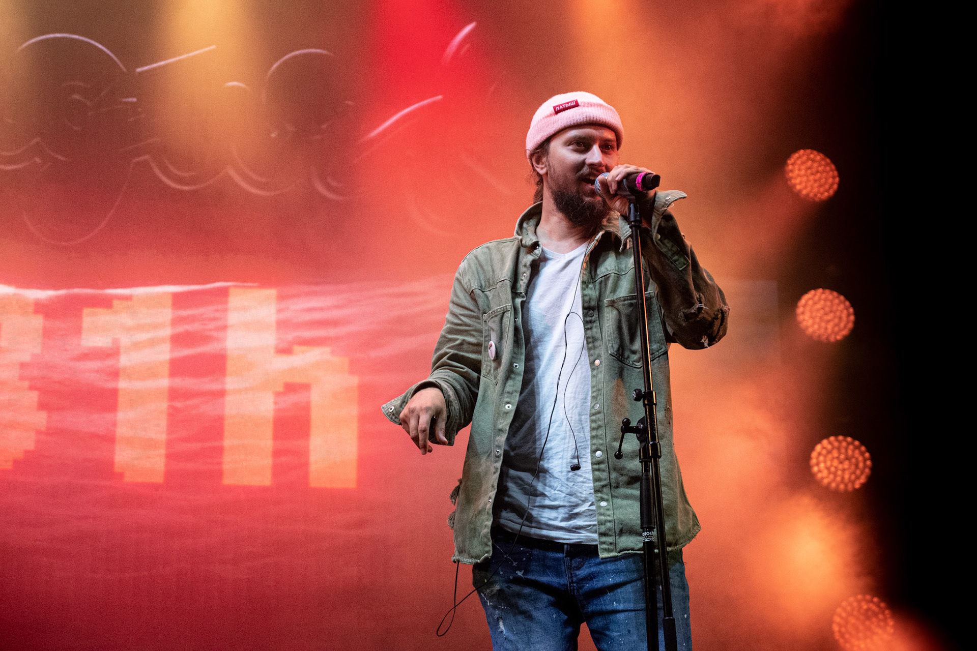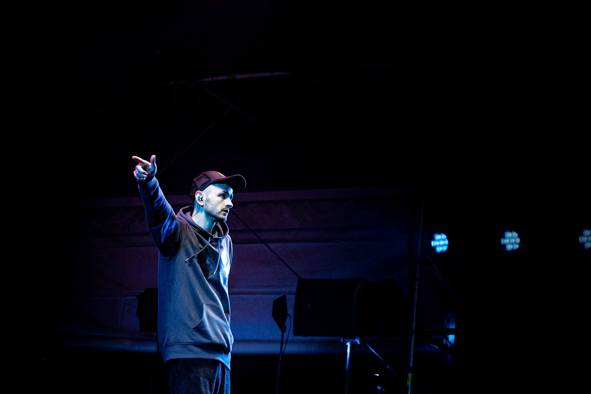 Concert photography from ansis performance at Mežaparks Green Theatre, capturing his sharp lyricism, strong presence, and the open-air energy of a summer evening show.