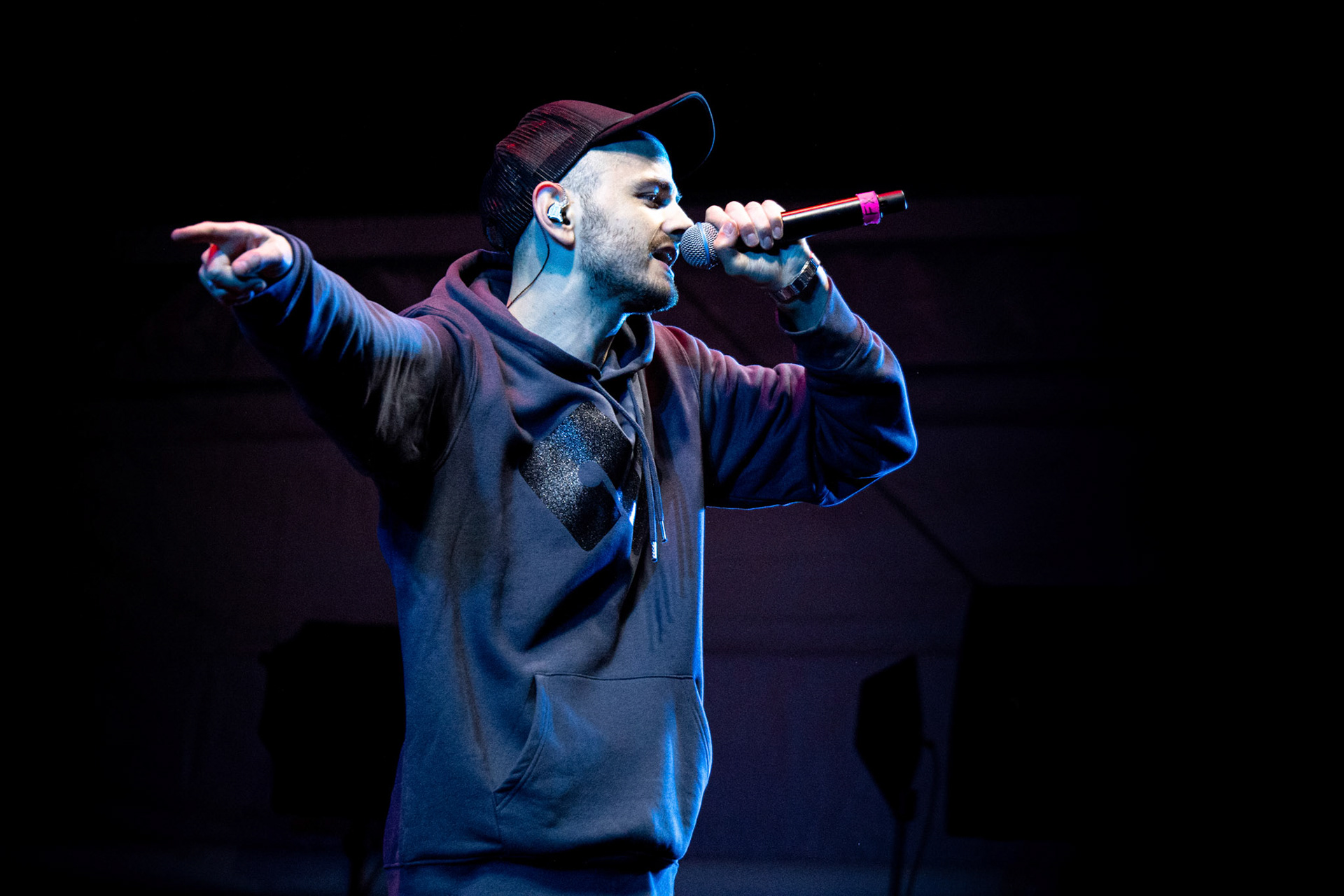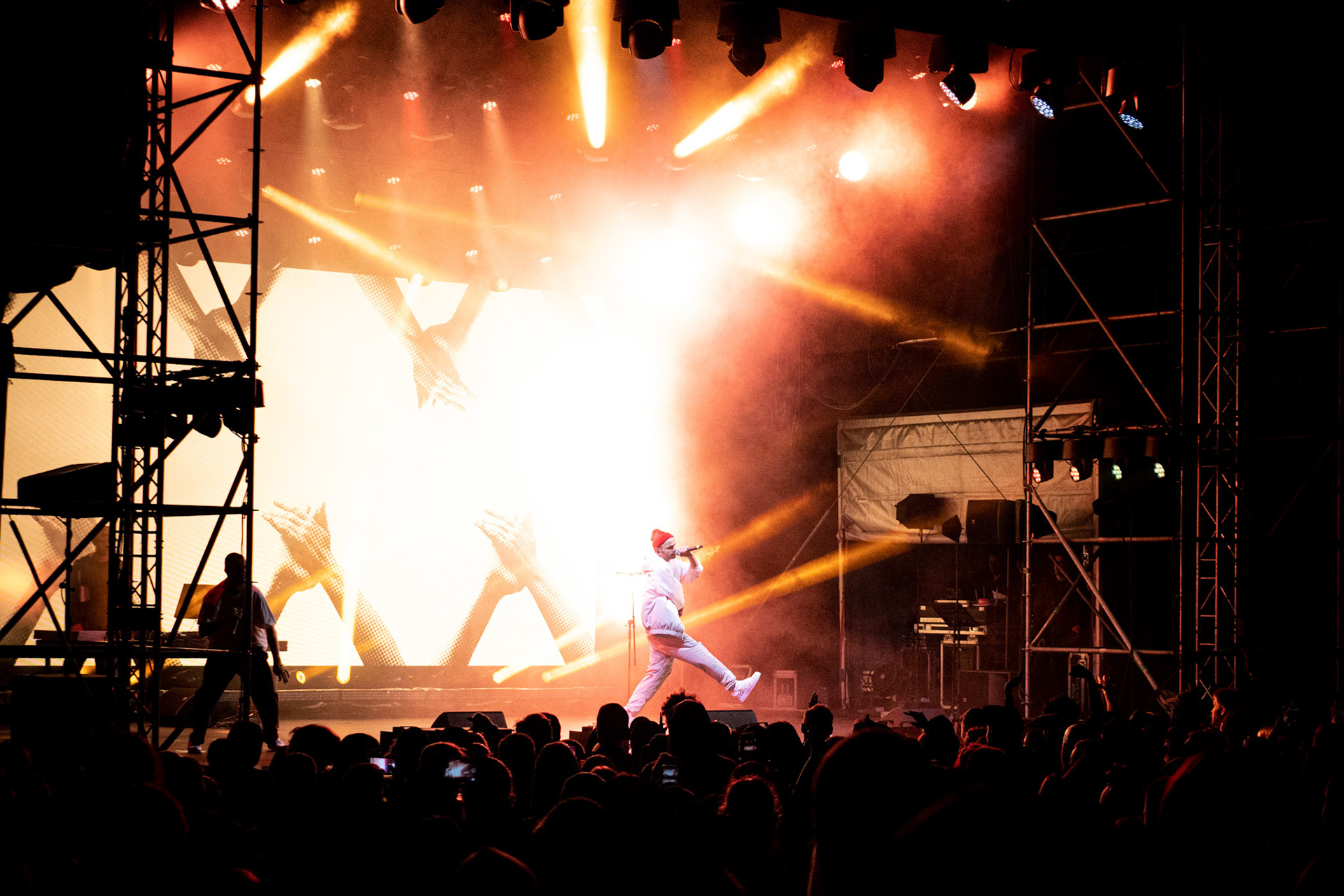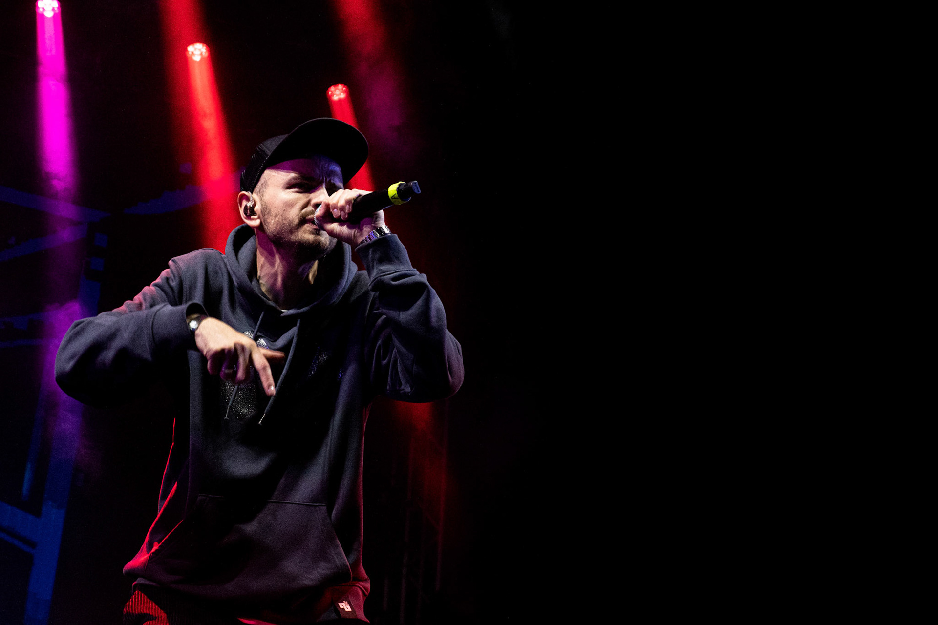Concert photography from ansis performance at Mežaparks Green Theatre, capturing his sharp lyricism, strong presence, and the open-air energy of a summer evening show.