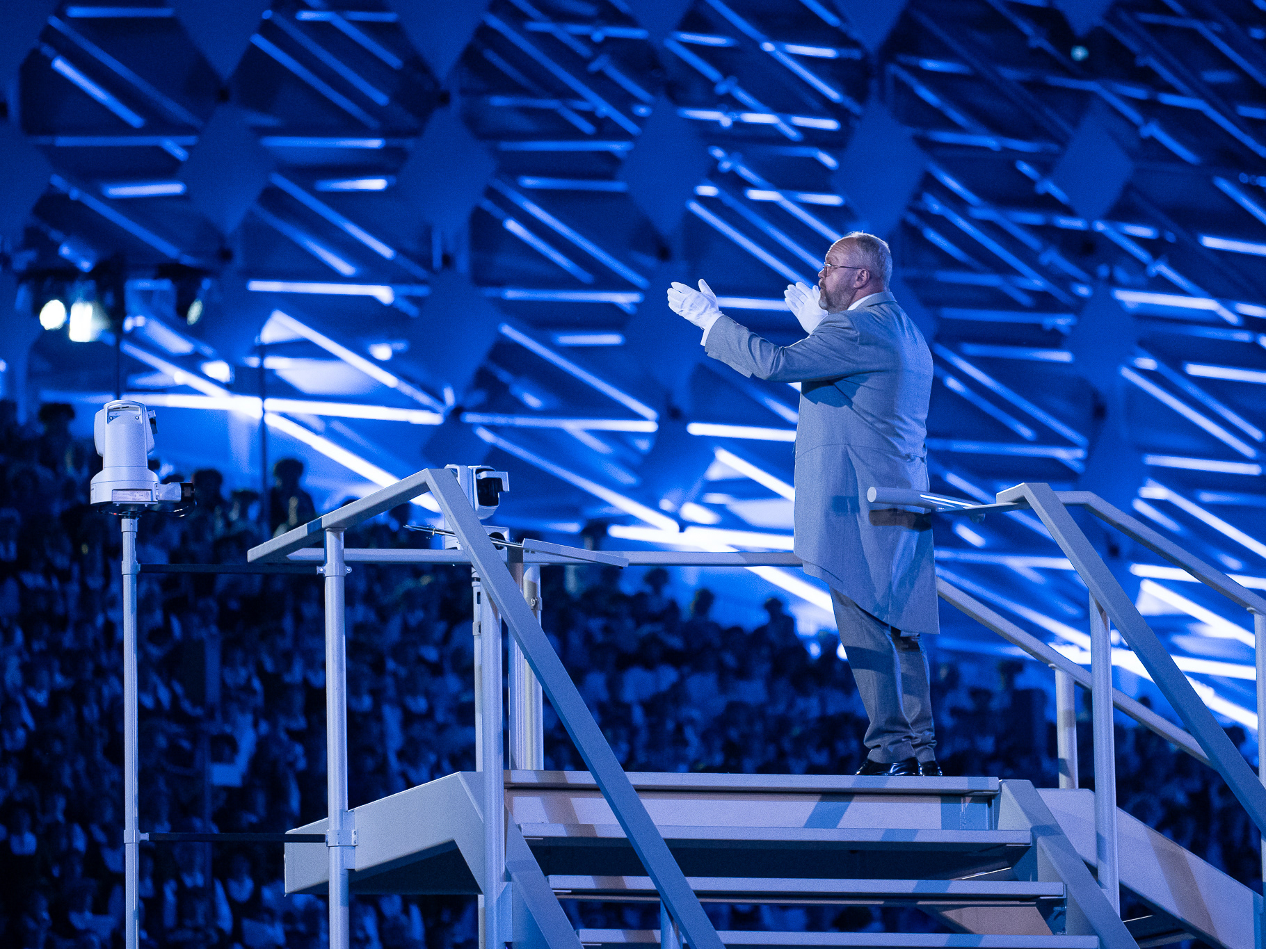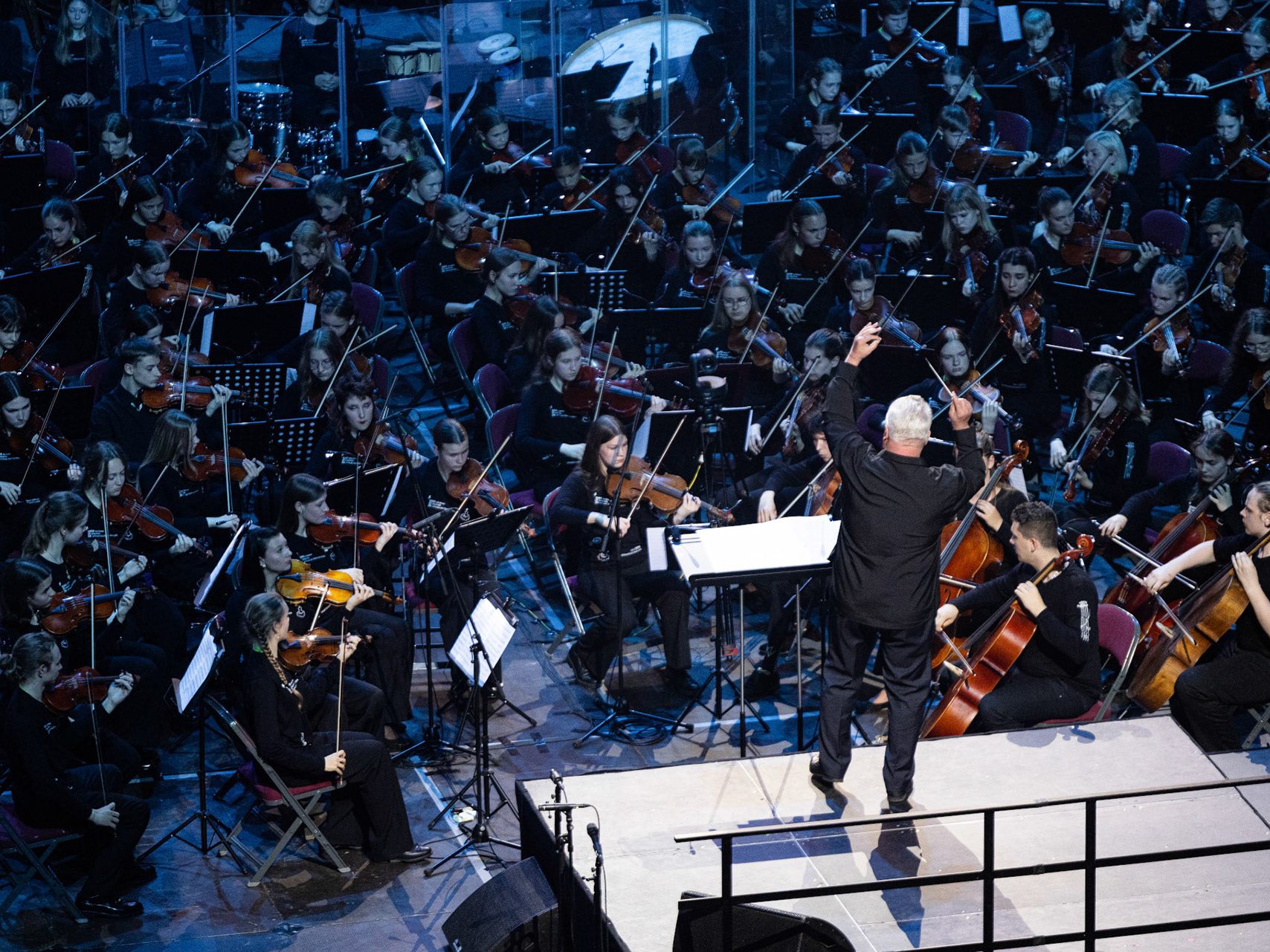 Photography from the XIII Latvian School Youth Song and Dance Festival symphony orchestra concert “Daudzbalsīgais Debesjums” at Xiaomi Arena, capturing orchestral energy, rich soundscapes, and the atmosphere of young musicians performing together.