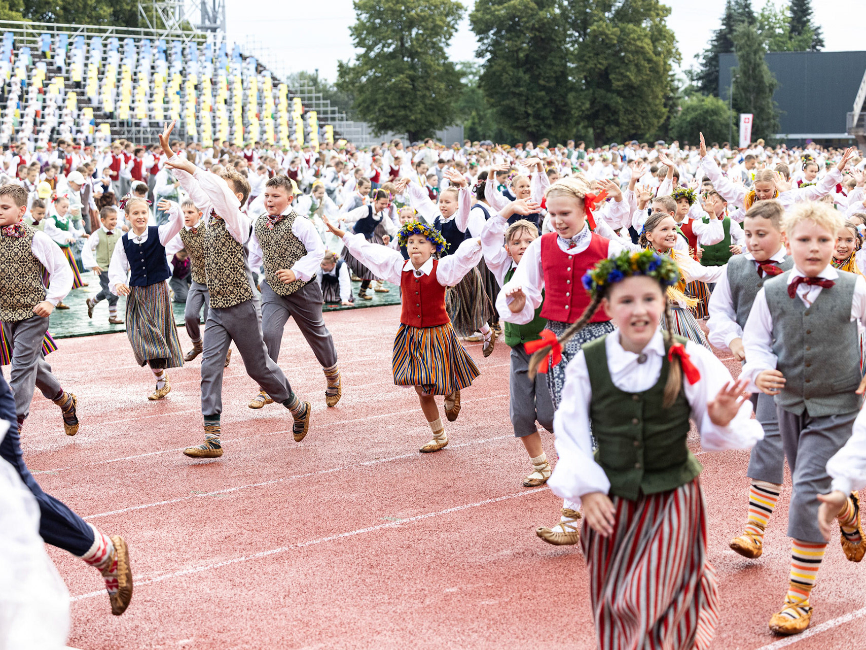 Photography from the XIII Latvian School Youth Song and Dance Festival’s dance grand concert “Es atvēru Laimas dārzu” at Daugava Stadium, capturing vibrant choreography, color, tradition, and the collective energy of thousands of young dancers.