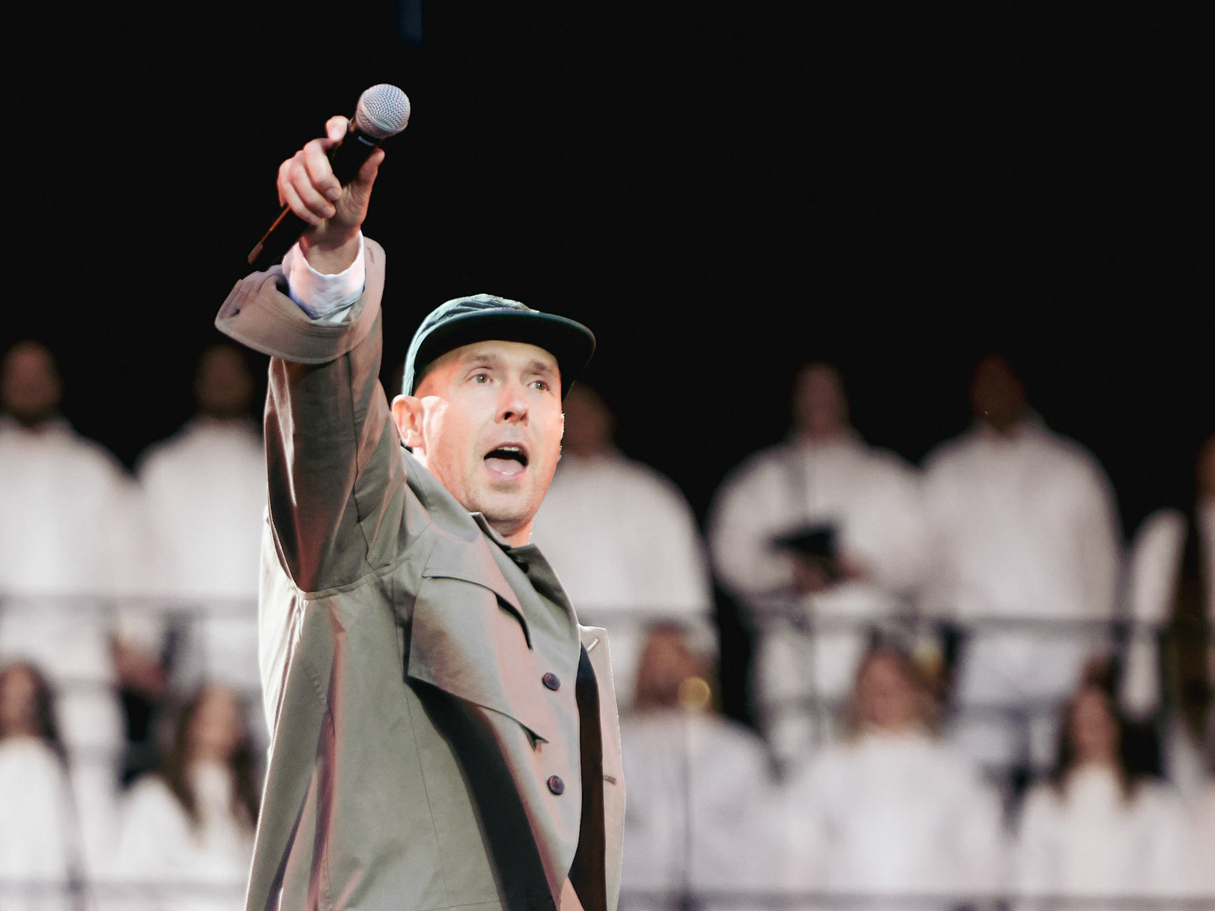 Concert photography from ansis performance at Mežaparks Green Theatre, capturing his sharp lyricism, strong presence, and the open-air energy of a summer evening show.