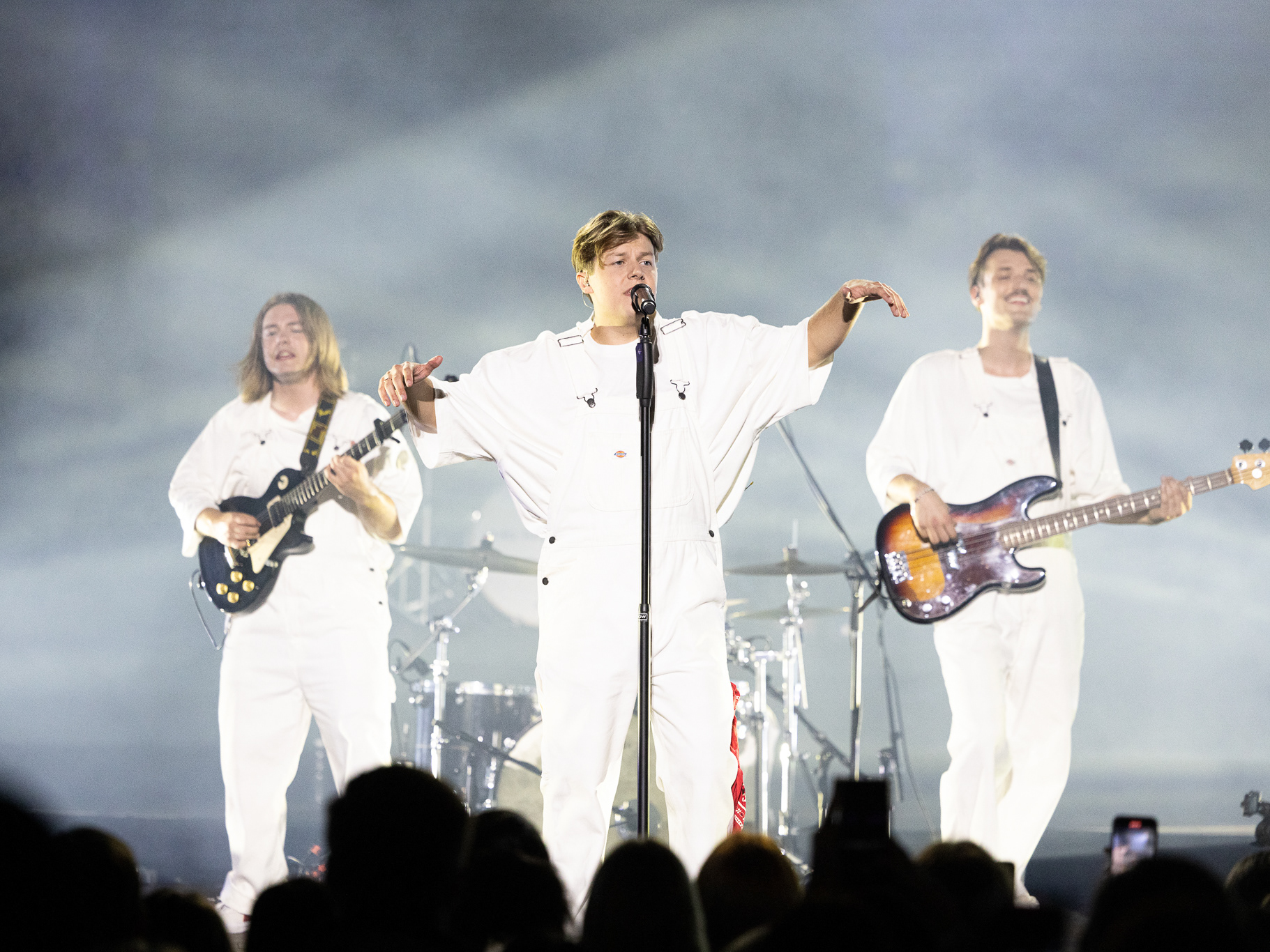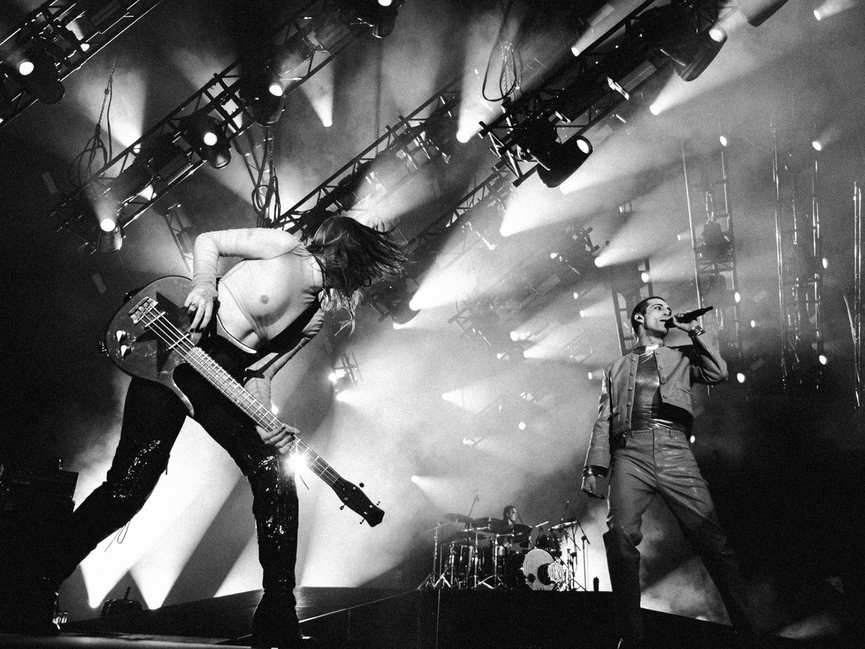 Concert photography from Måneskin performance at Mežaparks Great Stage, capturing their explosive rock energy, bold stage presence, and the electrifying atmosphere of the open-air show.