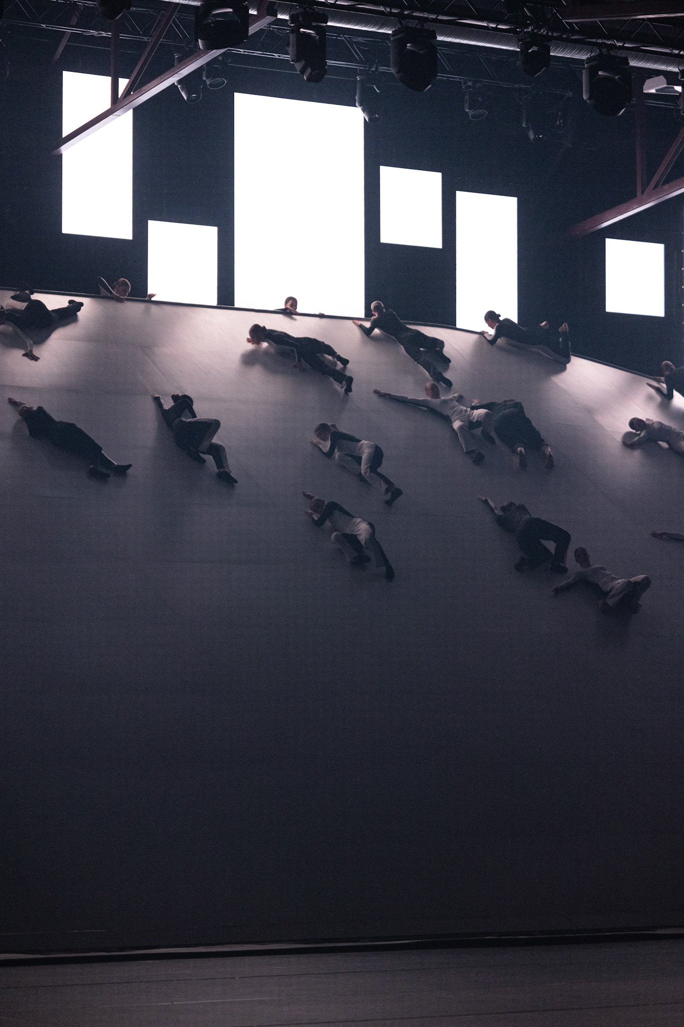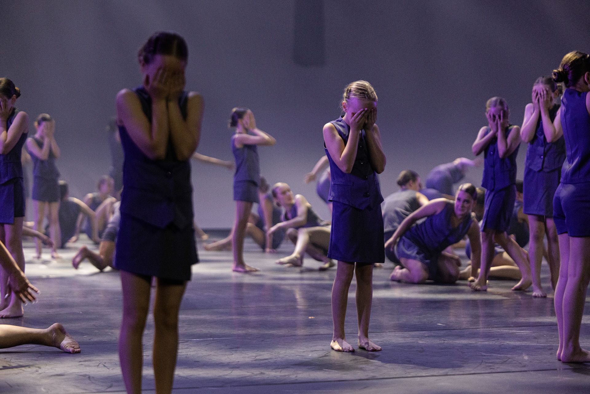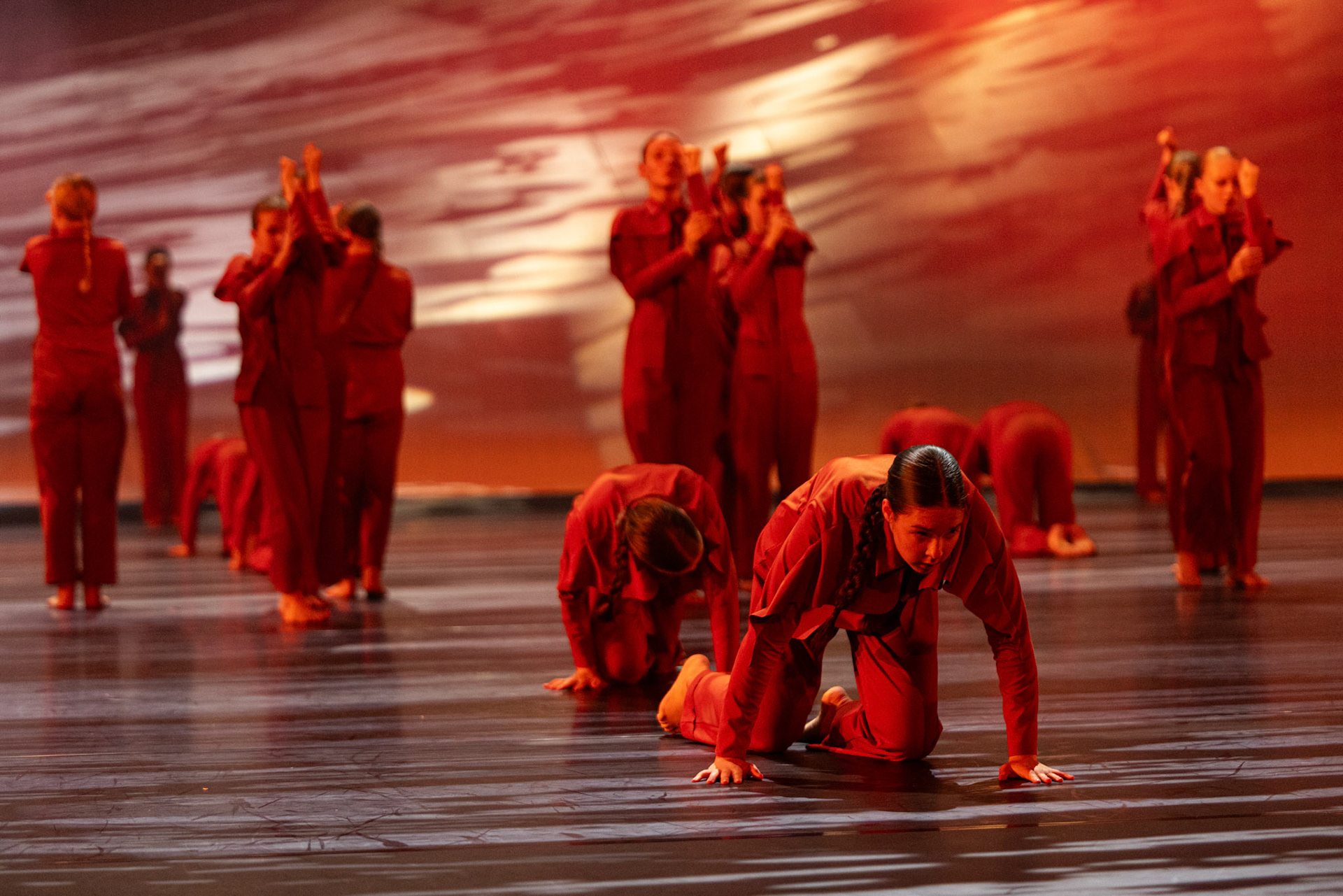 Photography from the contemporary dance performance “Kastaņa puslode” at the Ķīpsala Exhibition Centre during the XIII Latvian School Youth Song and Dance Festival, capturing movement, expression, and the creative energy of young dancers.