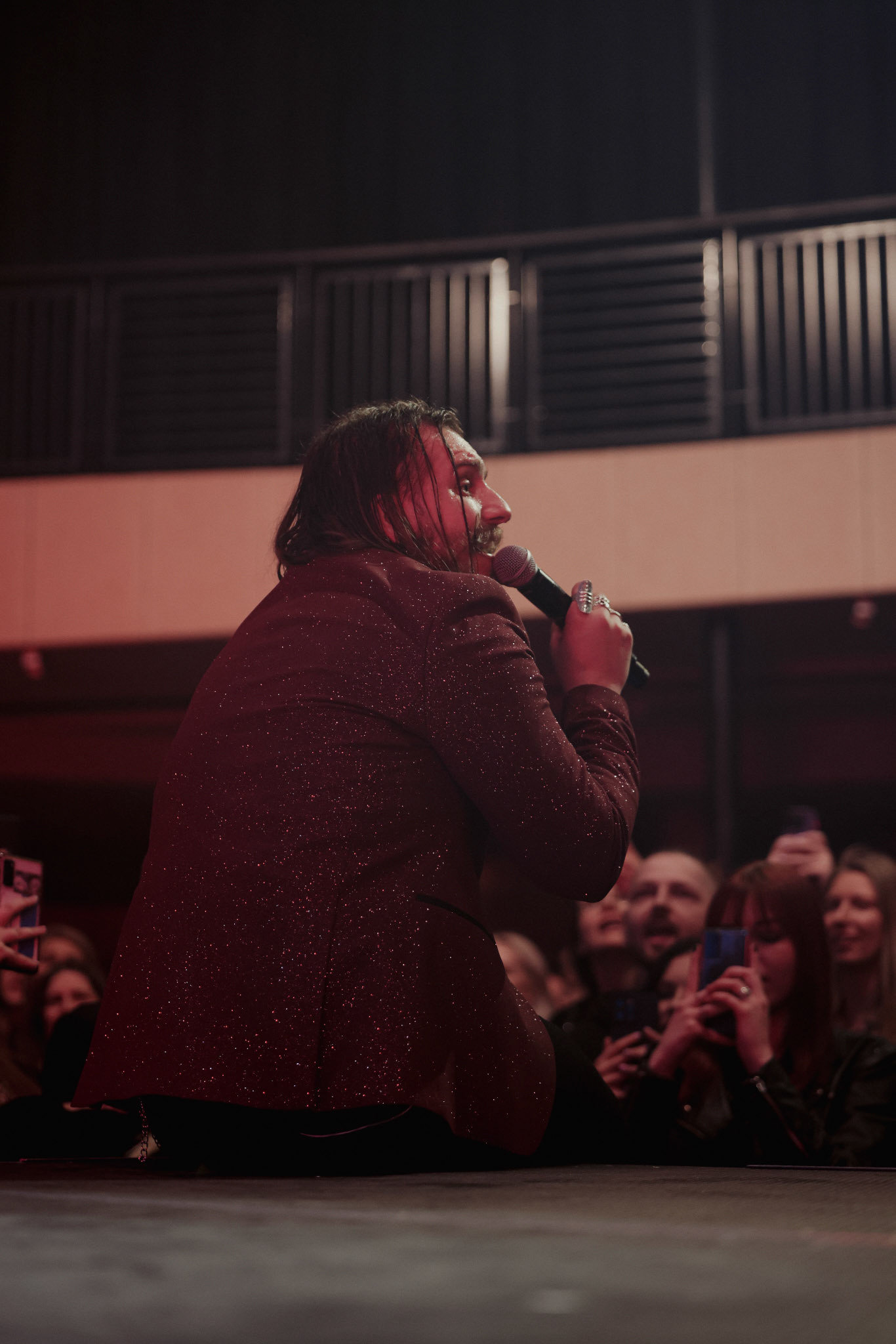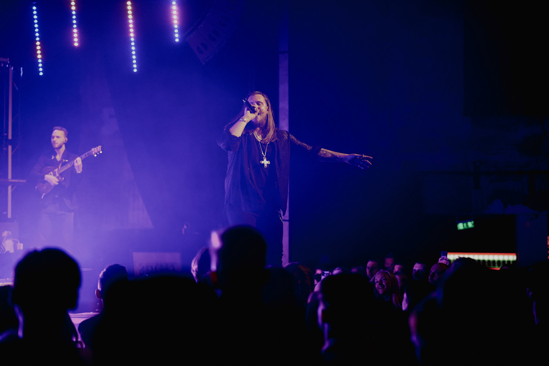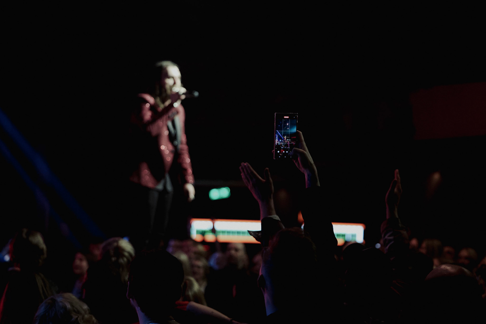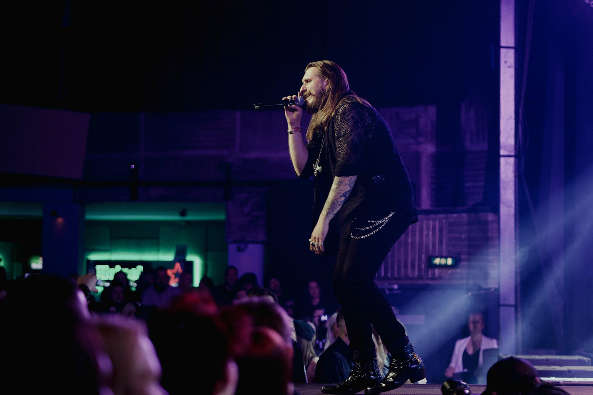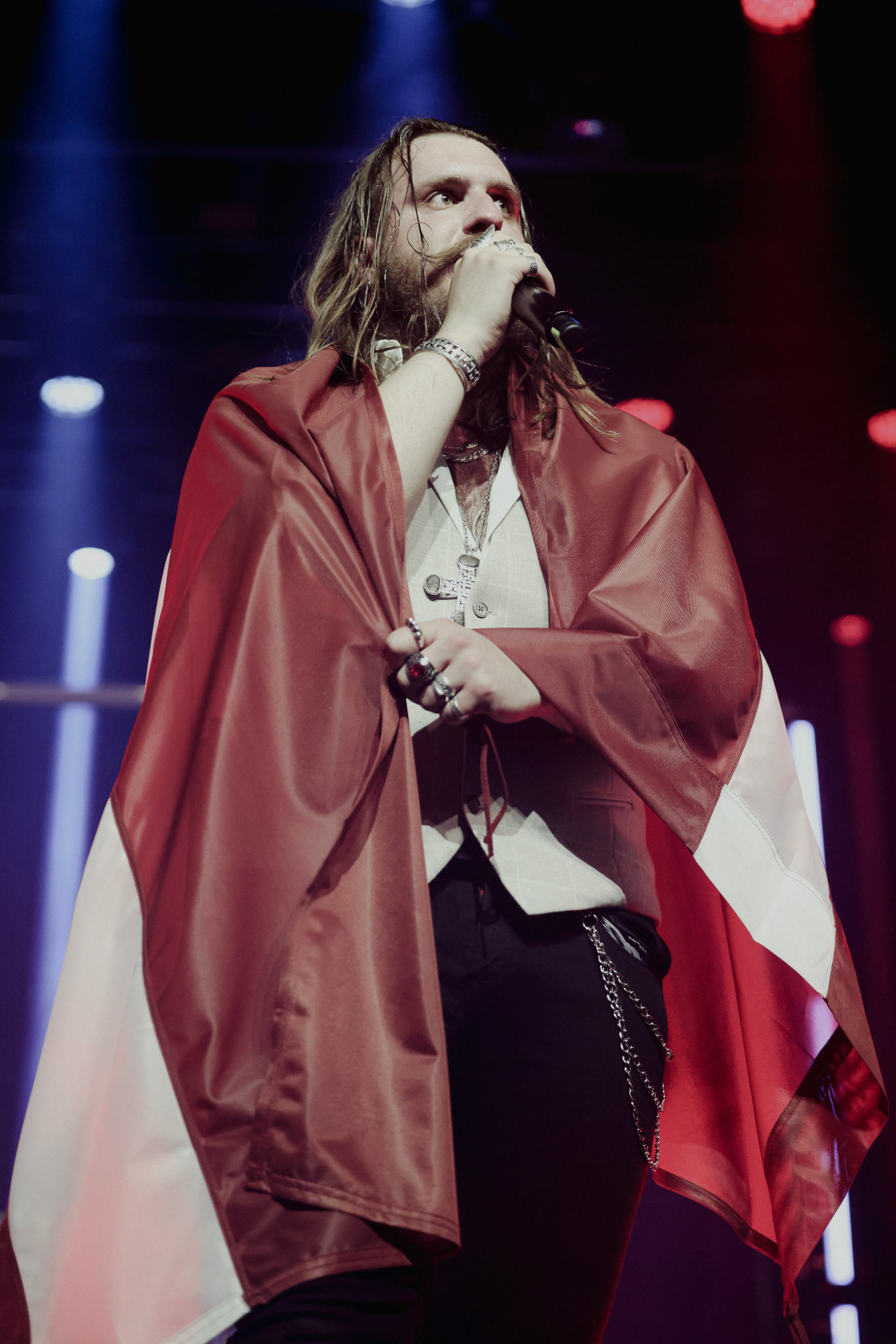 Concert photography from Miks Galvanovskis performance at Palladium Riga, capturing his emotional delivery, dynamic stage presence, and the intimate connection with the audience.