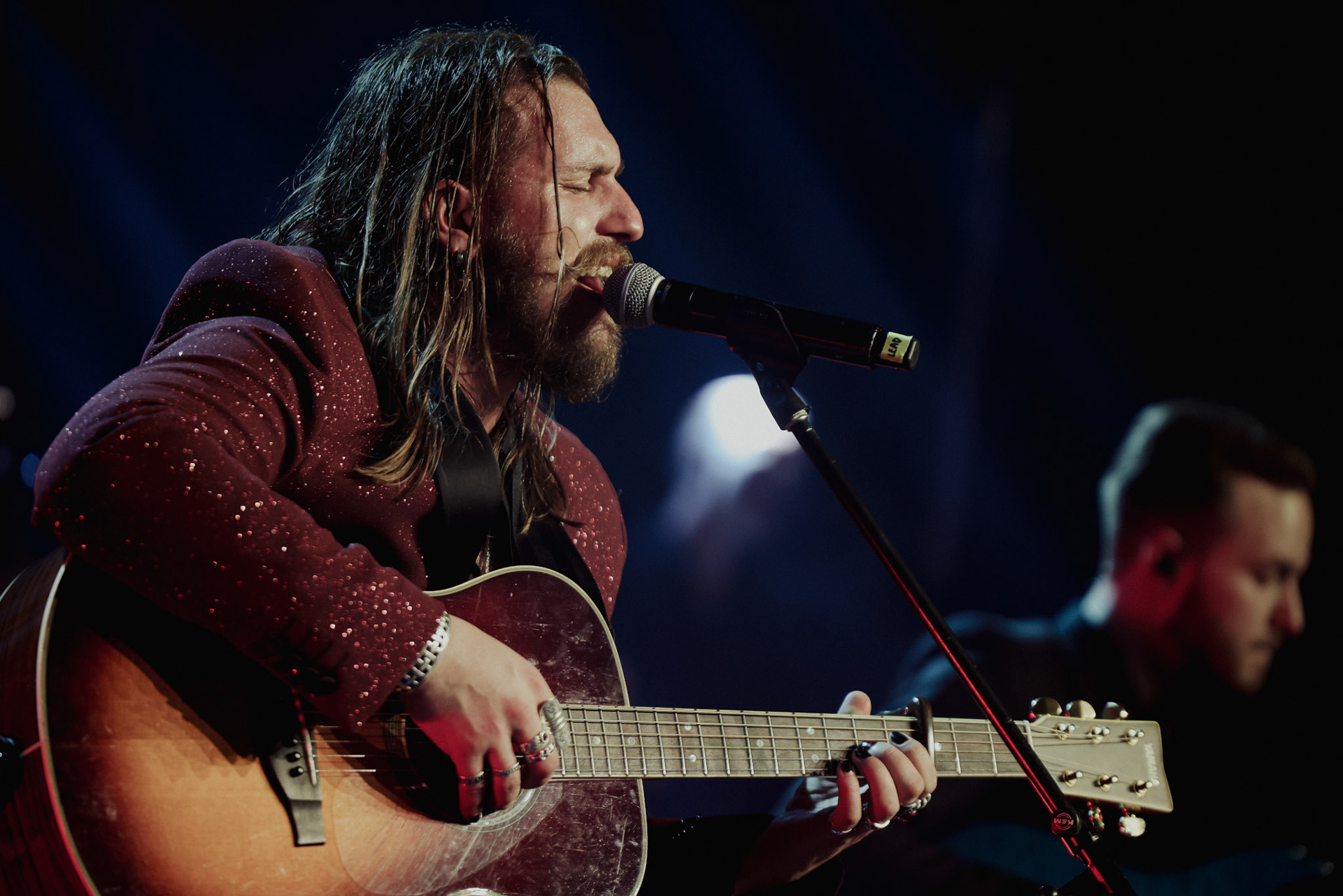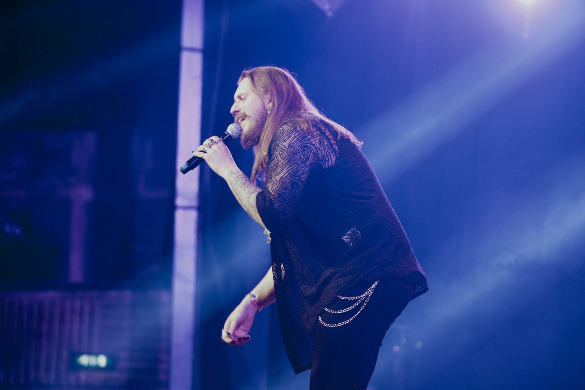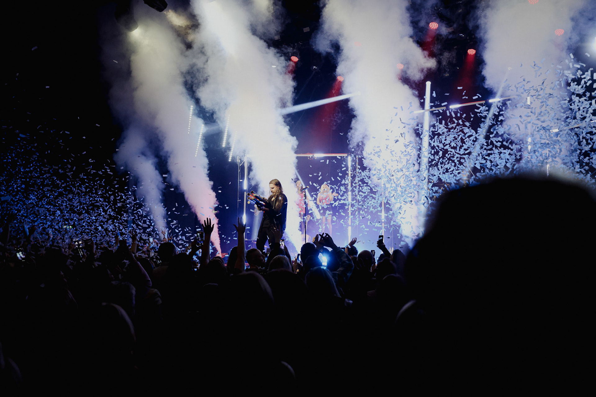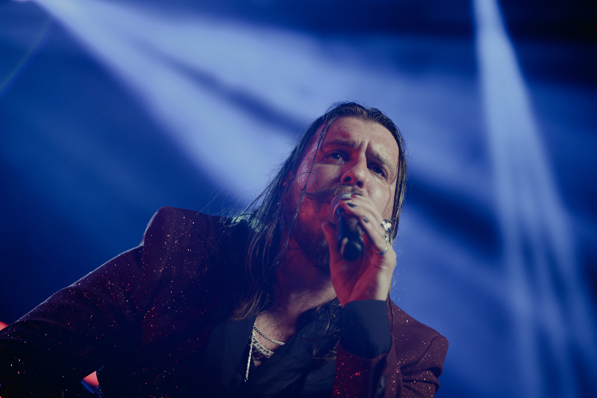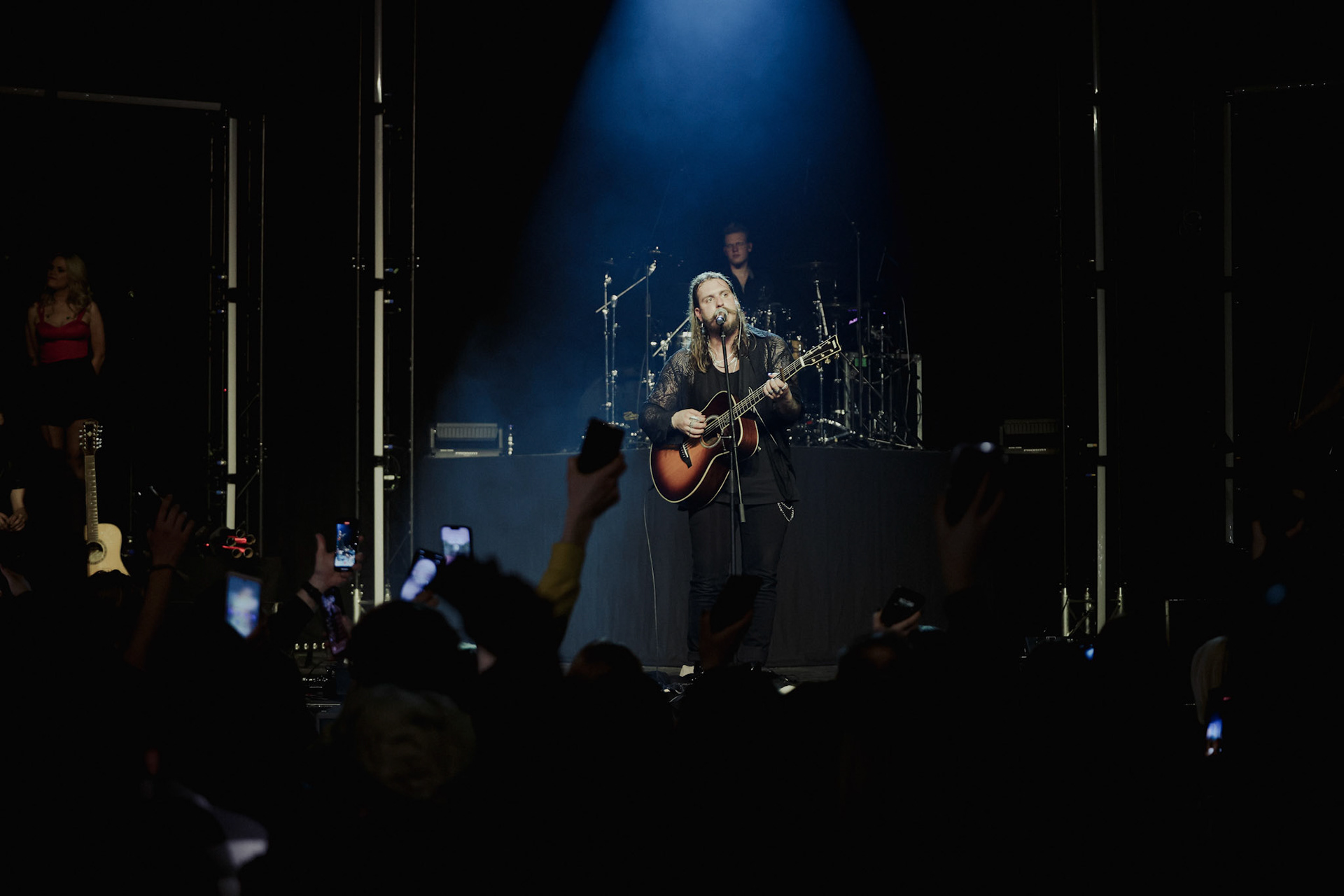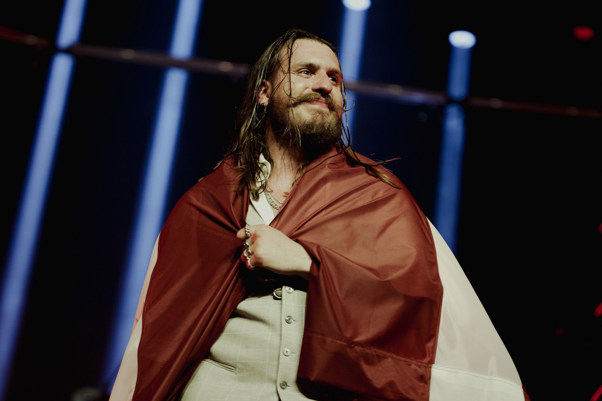 Concert photography from Miks Galvanovskis performance at Palladium Riga, capturing his emotional delivery, dynamic stage presence, and the intimate connection with the audience.
